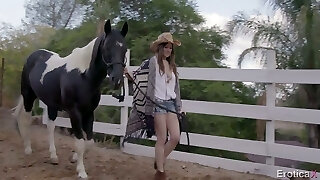 cool auburn aux cheveux cowgirl langues tronc et fait le diable dans la grange