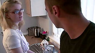 babysitter stava cercando di lavare i piatti, ma ha finito per ingoiare una grande sborrata invece!petite teen fiona brandy prende scopata