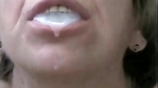 甜蜜的女孩带着男朋友的巨大凿子在她的下巴和吉斯吞下